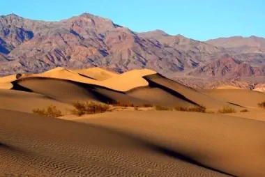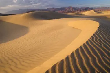 These dunes are the best known and easiest to visit in the national park. Located in central Death Valley near Stovepipe Wells, access is from Hwy. 190 or from the unpaved Sand Dunes Road. Although the highest dune rises only about 100 feet, the dunes actually cover a vast area. This dune field includes three types of dunes: crescent, linear, and star shaped. Polygon-cracked clay of an ancient lakebed forms the floor. Mesquite trees have created large hummocks that provide stable habitats for wildlife.